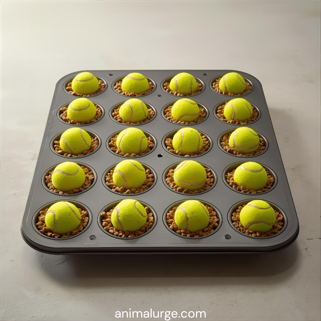 Place treats or kibble into the cups of a muffin tin, then cover each opening with a tennis ball. Your dog must nudge or lift the balls to reveal the food underneath.